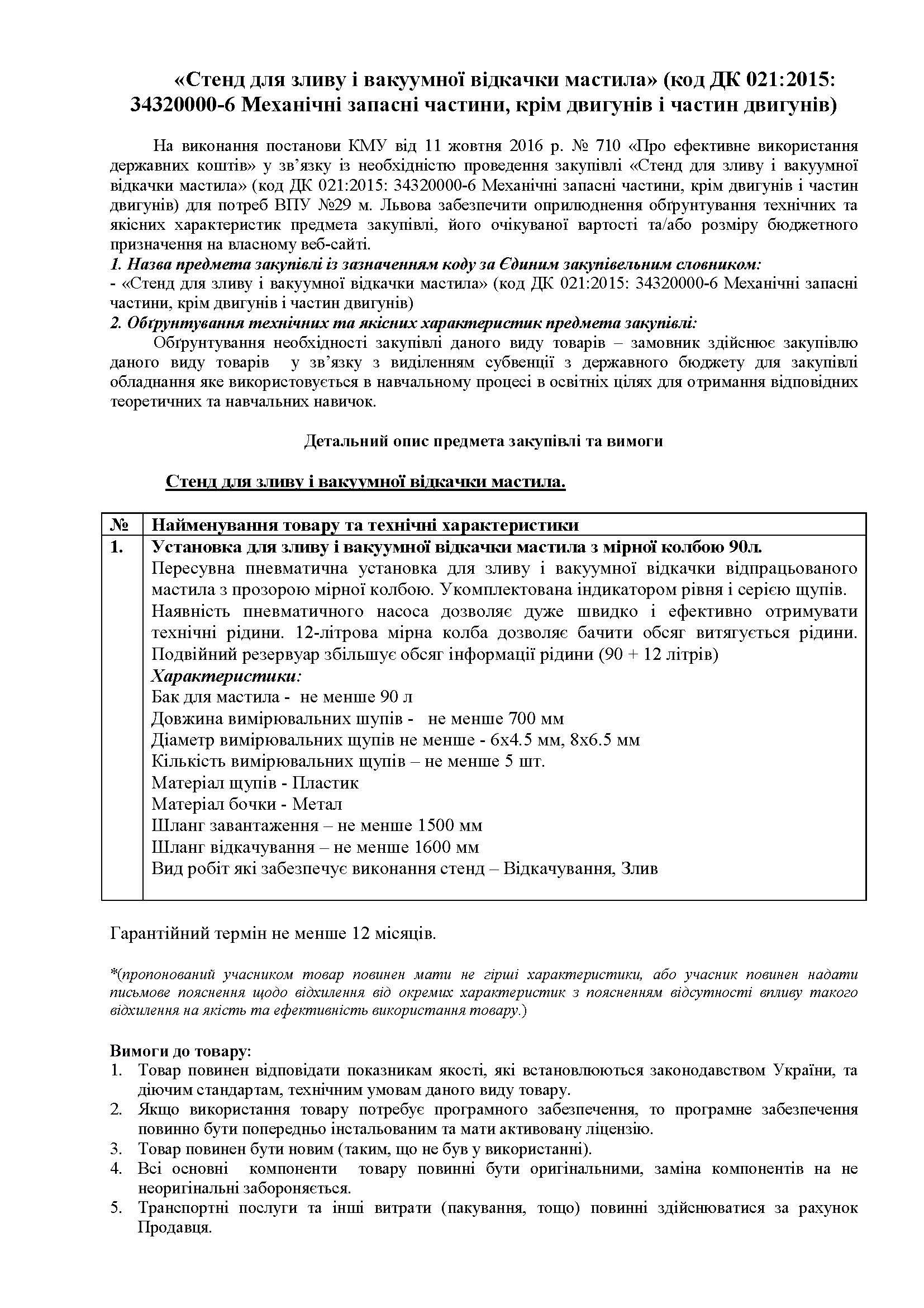 Обгрунтування закупівля (Стенд для зливу і вакуумної відкачки мастила)